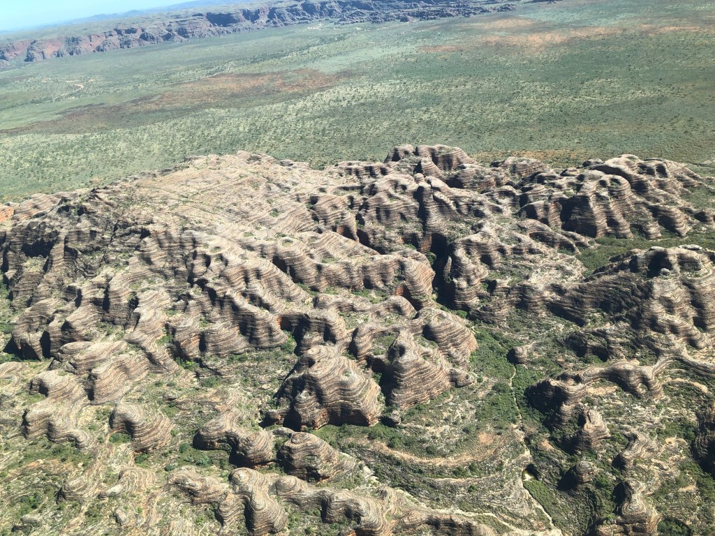 We landed at the Bungle Bungles for a short bus trip and then a 5 km wander around. Following the wet season, there’s still a little bit of water lying around. Unfortunately, cane toads have made it out here. Apparently their only predator is a crow – the crows swoop them up and then drop them down onto the rocks where they splatter. The crows take the contents of their stomach but leave the rest. The outcome of this is that there are dead cane toads spreadeagled over rocks and it was quite stinky around some of the water holes.