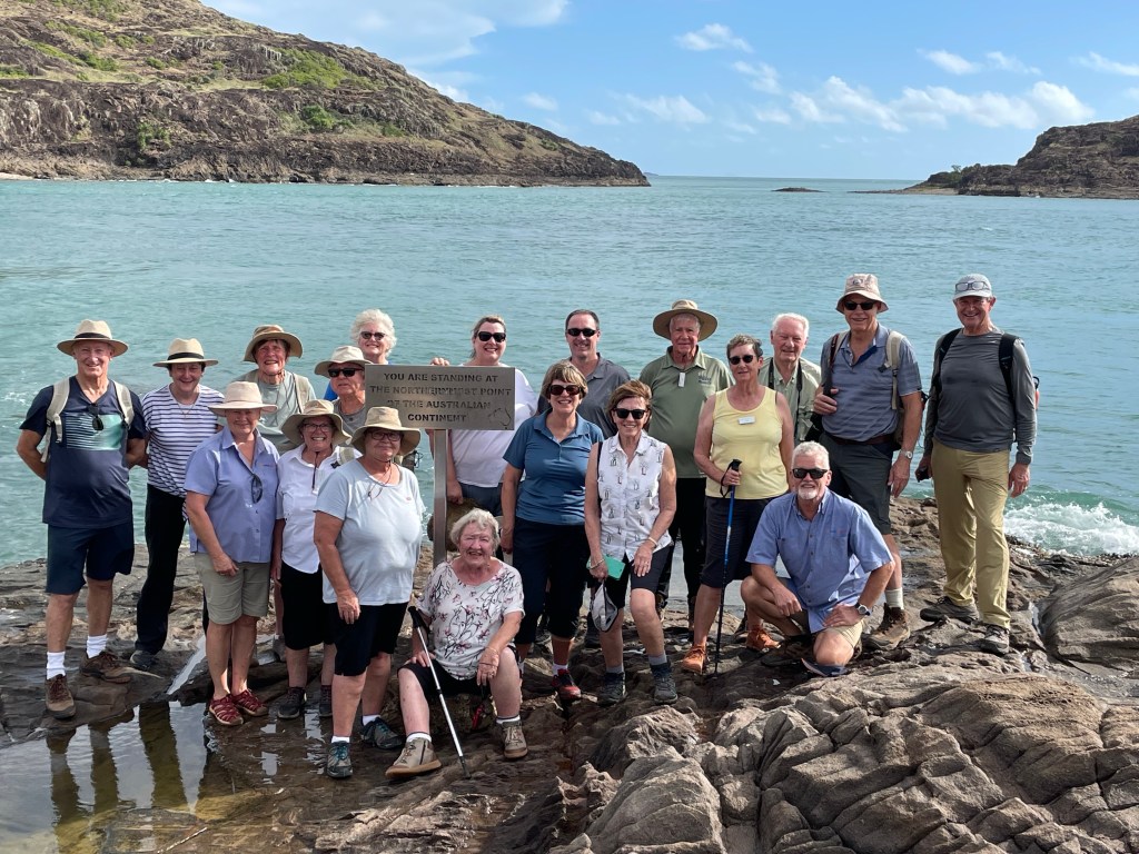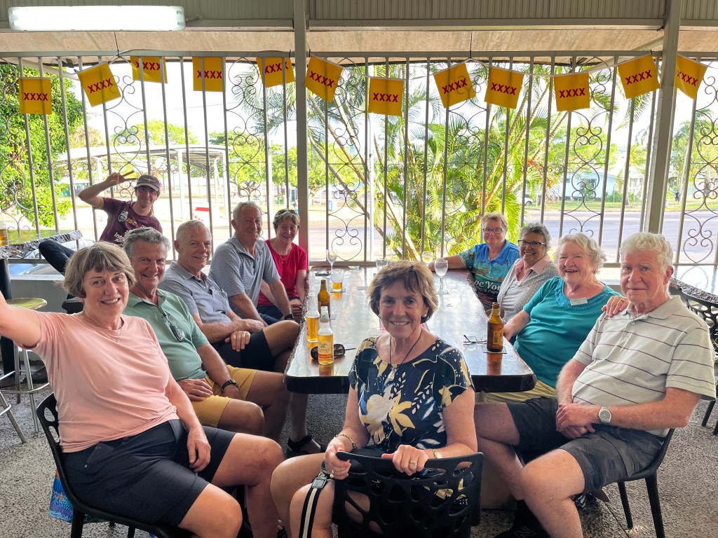 That afternoon we caught the school bus over to Friday Island, which has a population of 3. There’s an old Japanese guy there who runs a pearl farm and gave us a demonstration of how he cultivates and harvests the pearls. On return we adjourned to the top pub in Australia for some very ordinary wine. The first night of our tour we went for drinks beside the pool expecting people would join us- but no one did. This time we just mentioned that we were heading to the pub.