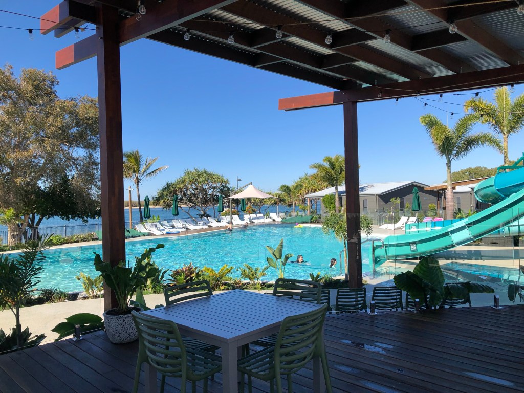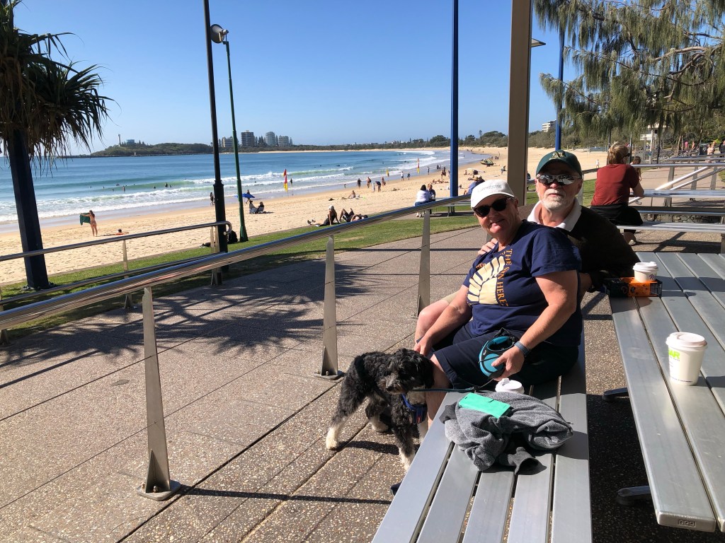 The great thing about caravan parks is that Mr Whippy vans still do the rounds. Particularly nice when they do it early afternoon when you’re looking for a sugar hit. My park at Caloundra is another great one. Coffee/breakfast van, pizza and wine van serving to an alfresco dining area and live music Friday. The pool is the best yet – long enough to swim laps in, water slides and all overlooking the ocean. The buildings in the background are ocean side cabins. It’s just about the perfect park – with the exception that it doesn’t allow dogs.