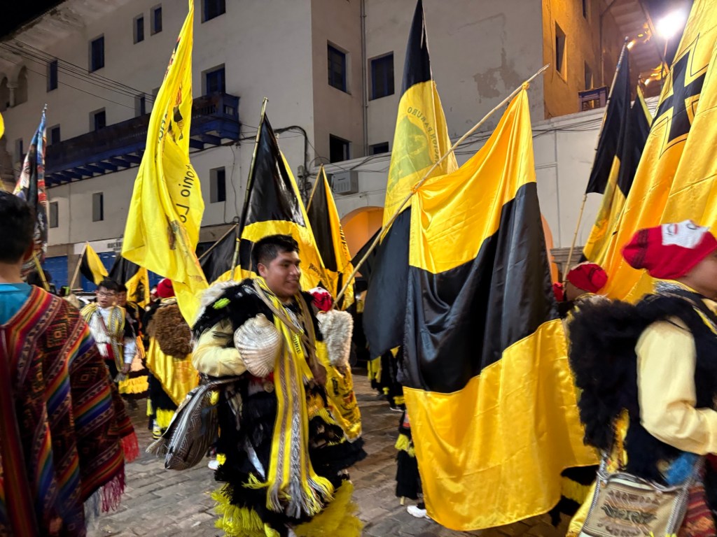 Cusco was the Incan capital with its major citadel. when the Spanish defeated the Incas they pulled down the citadel and built their cathedral on its site. The country now is strongly catholic, but they still follow a lot of the traditional religious and cultural traditions. The photo below captures this – an Incan chief delivering a ceremony with the Christian cross on the mountain in the back.