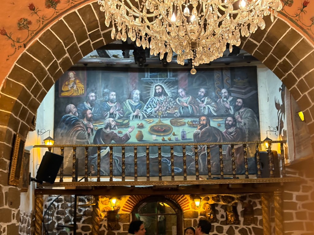 The catholic religion has been localized nicely. In the cathedral we visited, there was a picture of the last supper prepared by a local artist in the 17th century. No pictures were allowed, but there was a copy at the restaurant we ate at that night. They were feasting on guinea pig and Judas was represented by the leader of the Spanish invaders .